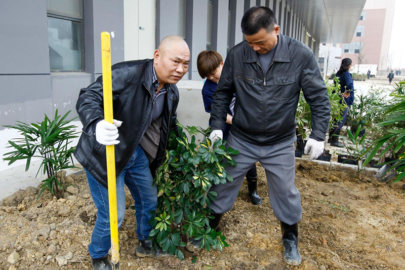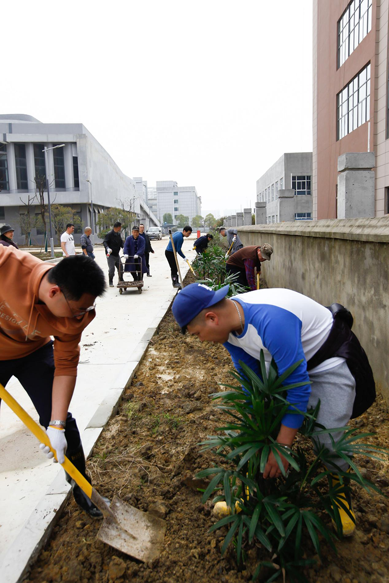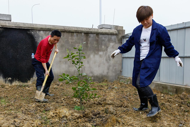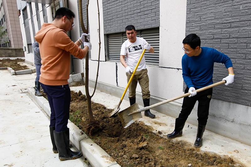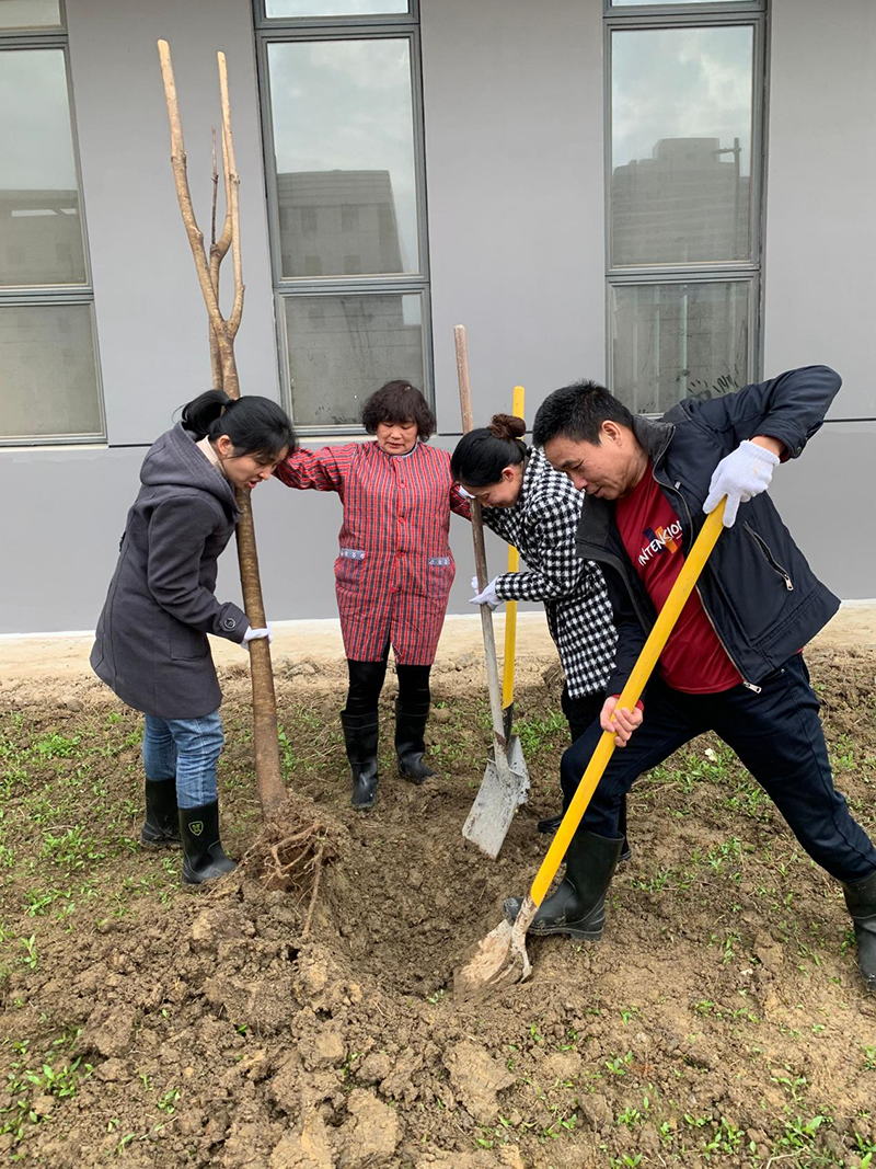 大家争先恐后地挥舞铁锹,或两人一组,或三人一组,有的卸车、挖洞、有的扶正,有的浇水,分工明确,配合默契,合力栽下一棵棵树苗。将近正午时分,200多棵树苗就稳稳地深扎在泥土里,在和煦的春风中,挺拔的树苗错落有致,呈现勃勃生机。植树间隙,行政部总经理黄煌在劳动现场还不时叮嘱大家要保证栽种质量,切实提高种植树苗的成活率。