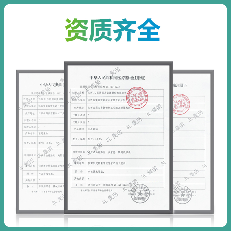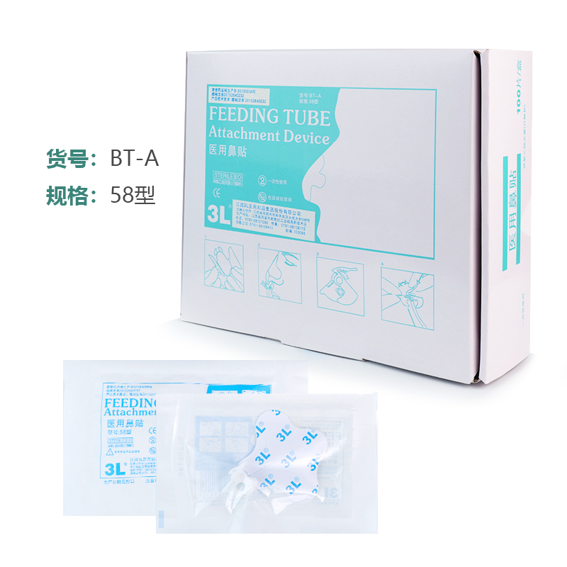 医用鼻贴:由无纺布、医用压敏胶、夹管器、隔离纸制成。供需固定输氧管或胃管的病人使用。