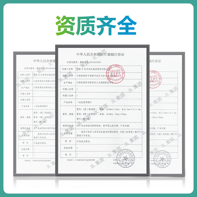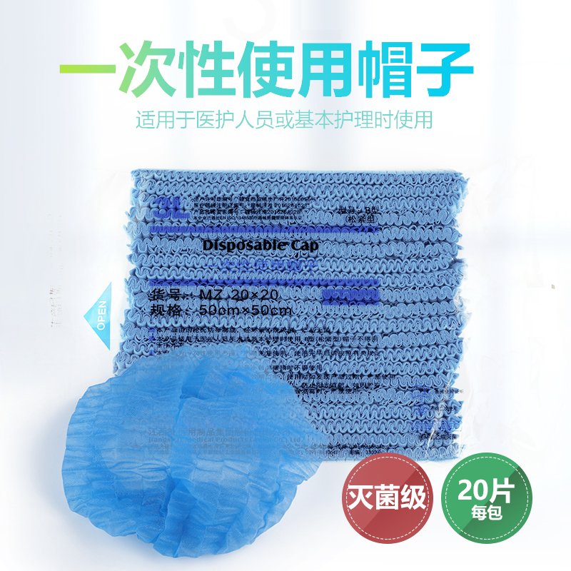 一次性使用帽子:采用无纺布、松紧带制成。适用于医护人员手术或基本护理工作时使用。