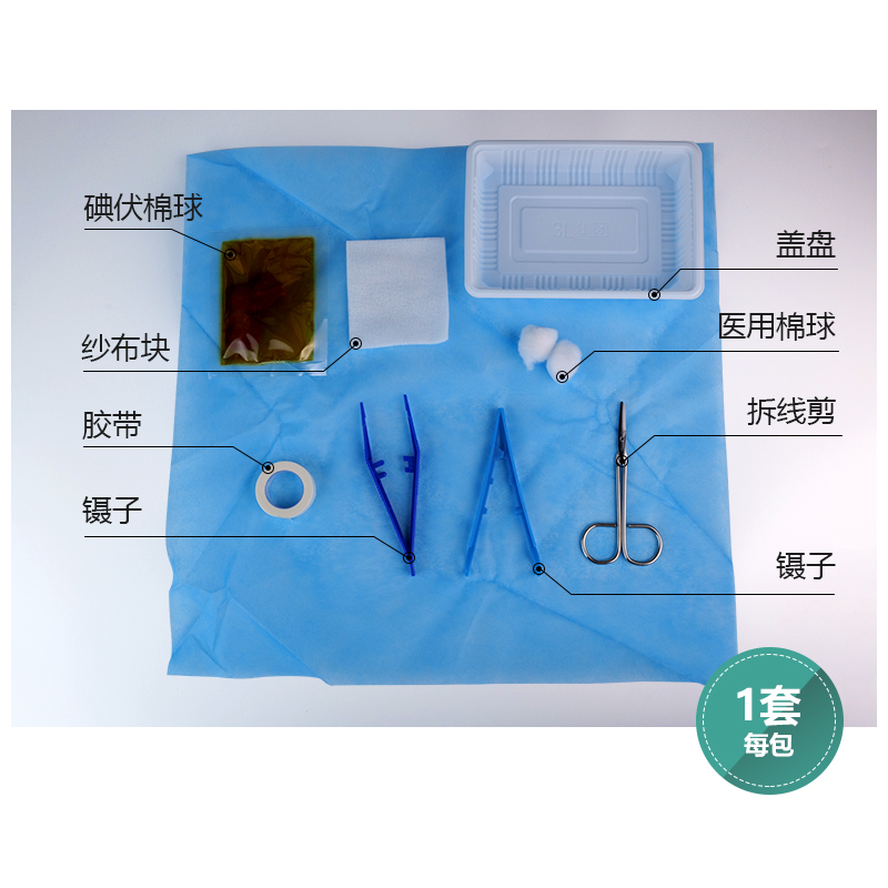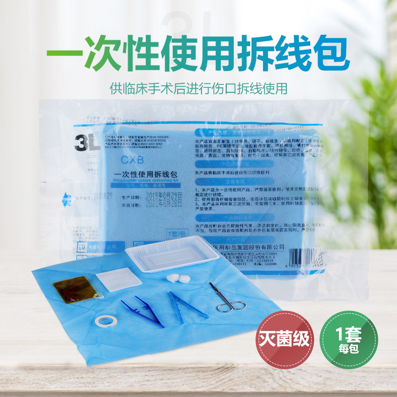 一次性使用拆线包:由纱布块、镊子、拆线剪、等主要组件,可根据需要选配组件。供临床手术后进行伤口拆线使用。