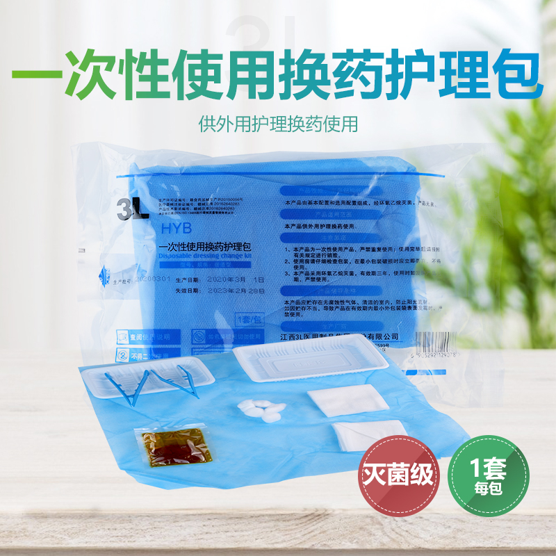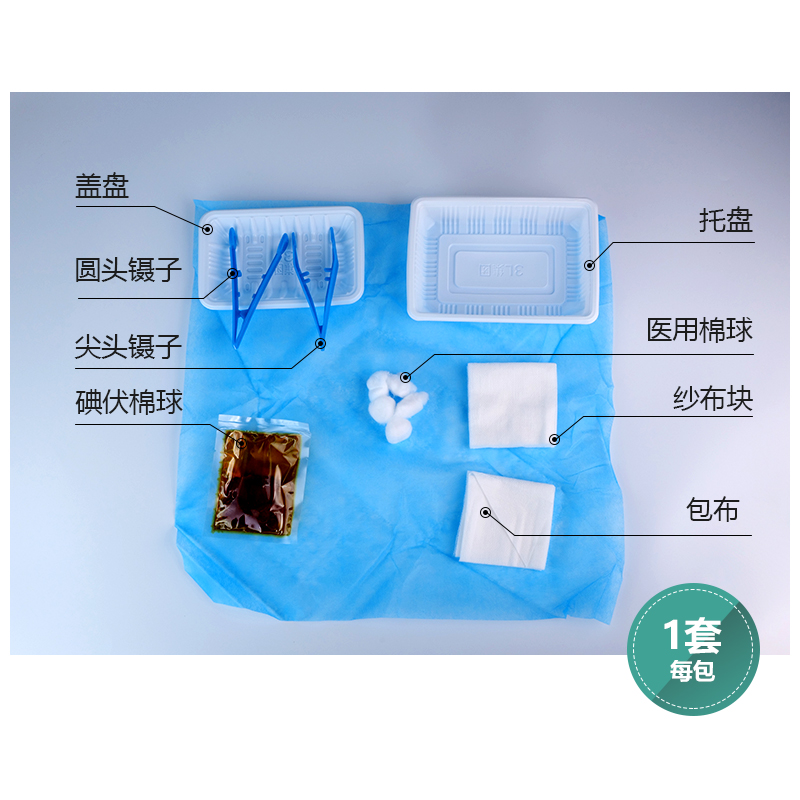 一次性使用换药护理包:由纱布块、镊子、托盘、医用棉球、医用棉签等主要组件,可根据需要选配组件。供外用护理换药使用。